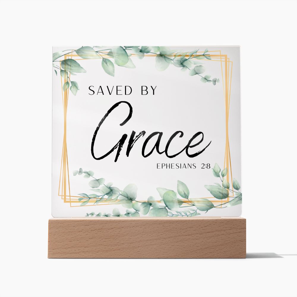 Saved By Grace Christian Home Acrylic Sign With Wooden Base